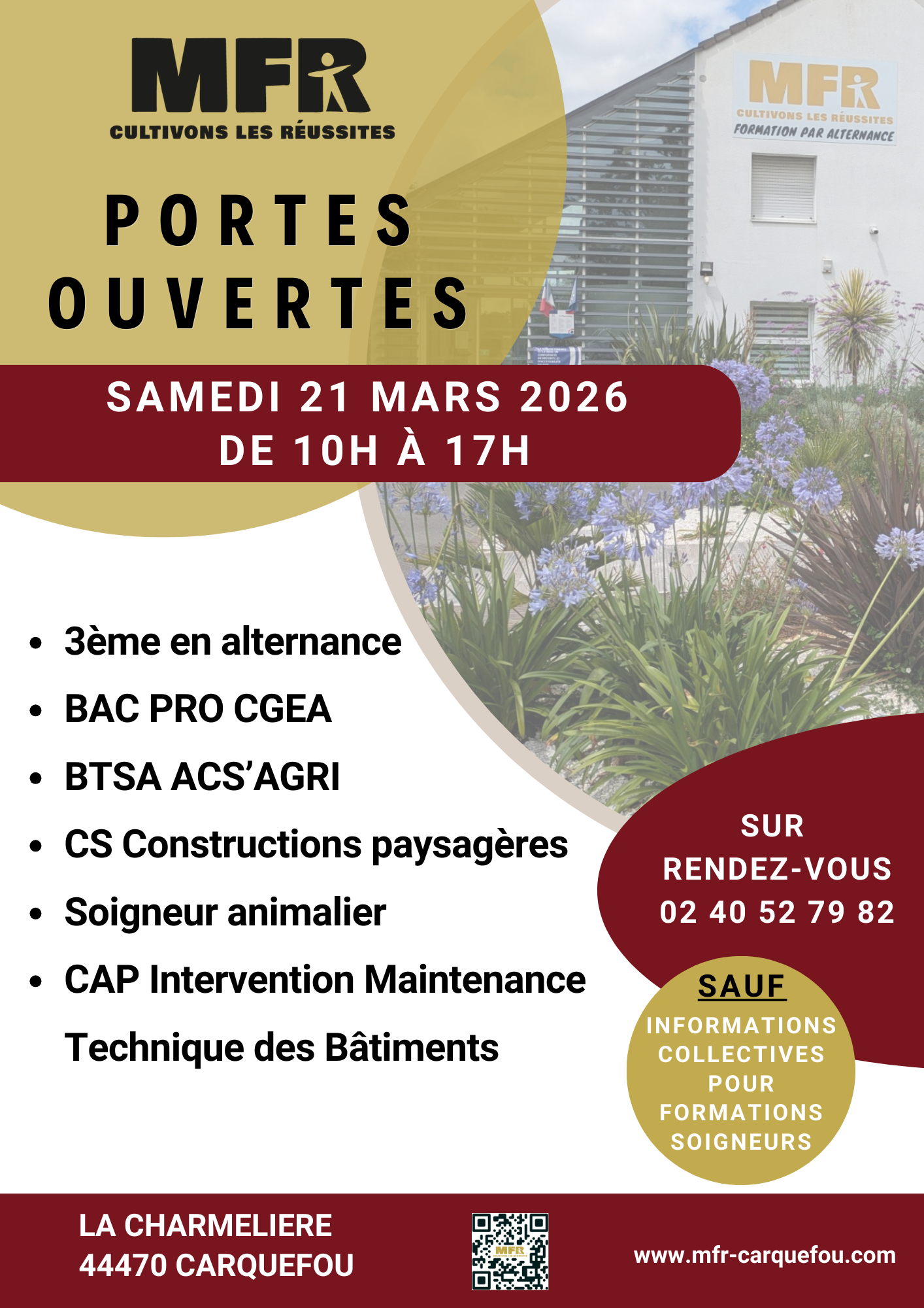 Située à seulement 15 minutes de Nantes, la Maison Familiale Rurale – CFA de Carquefou propose 4 filières de formations dans les domaines de :